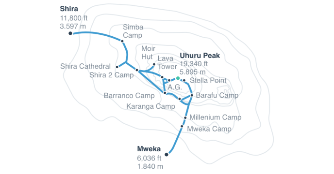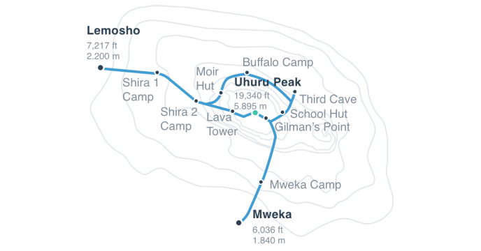| 3 | Shira 2 Camp | 3,810m/ 12,500ft | Lava Tower | 4,630m/ 15,190ft | 4-5 | 7km/ 4mi |