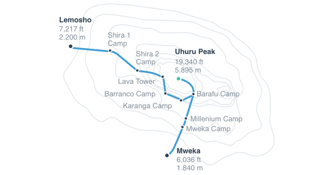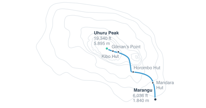 | Uhuru Peak | 5,895m/ 19,341ft | Mweka Camp | 3,068m/ 10,065ft | 4-6 | 12km/ 7mi | |