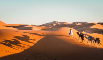 After breakfast, you'll spend three hours on a camel trek across the Erg Chebbi dunes into the rocky desert. Midday brings a rest and freshly prepared lunch in the desert quiet. The afternoon continues deeper into the sands where dunes reach up to 250 meters high. You'll watch the sunset from the summit, then have dinner with traditional music at your bivouac before sleeping under the stars.