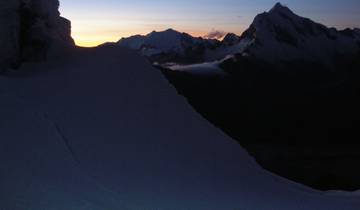The early start comes at 3:00 am as you begin climbing from camp. You'll cross moraines and then tackle glacier slopes that run 35 to 40 degrees steep to reach Nevado Pisco's summit. From up there, the views show you Chacraraju, Artesonraju, Huandoys, Caraz, Huascaran, and Alpamayo all around you. Getting to the top takes 6 to 7 hours, and after that you'll make your way down to Morrena camp to rest, have lunch, and recover before heading back to base camp.