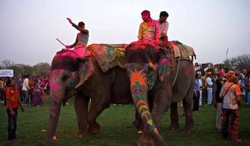 After breakfast, you'll transfer to Elephant Village for a full day celebrating Holi with the Ghum India Ghum Team. You'll participate in authentic festival celebrations alongside locals, play with colors, watch folk performances with dancing and music, and take part in elephant activities like riding, washing, painting, and feeding. Lunch will be a vegetarian buffet with water and snacks included, and you'll try traditional Bhang Lassi. You'll head back to your Jaipur hotel in the evening to relax and stay overnight.
