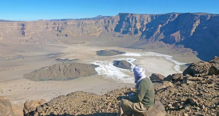 This morning you'll head toward the Tibesti Mountains following historic caravan routes. You'll reach Wadi Zouarke in the evening to refuel and restock supplies, then continue on rougher tracks to Trou du Natron. This massive caldera sits over 2000m high with volcanic features and white mineral crusts, and you'll see cone volcanoes about 700m below from your vantage point.