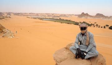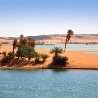 Heading southeast through the Emi-Koussi region, you'll see the Sahara's highest volcano at 3415m. Along the way you'll come across prehistoric rock paintings and engravings. Later you'll reach the UNESCO World Heritage Site of Ounianga Lakes, where sky-blue waters contrast sharply with green palm groves and red-yellow desert. Swimming in the fresh water is an option if you want to cool off.