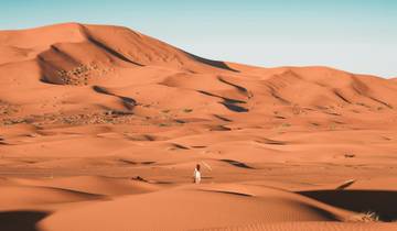 - Day 8MerzougaYou wake early to catch the sunrise over the sand dunes. Following breakfast, a 4x4 tour takes you deep into the Sahara to visit nomadic Berber communities and remote oases, seeing how rocky terrain shifts into expansive dunes. For lunch, you can choose between a picnic in the desert or a home-cooked meal with tea at a Berber family's home. Later in the afternoon, you relax, take photos, or climb a tall dune to watch the sunset, then return to your desert camp for another night. - Meals