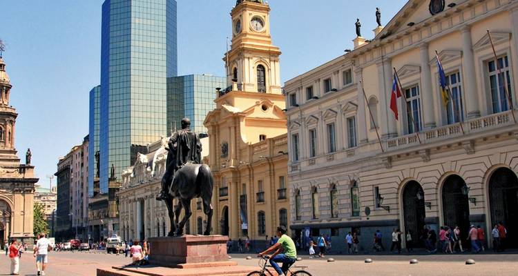Explore Santiago de Chile, a city where colonial buildings and modern skyscrapers mix together. Your city tour starts on Alameda where you'll see important buildings like the government palace and San Francisco church. You'll visit the main square with its cathedral and old post office, and the main fish and seafood market. The tour finishes at Cerro San Cristóbal viewpoint with panoramic views over the city to the Cordilleras. The rest of the day is yours to explore.