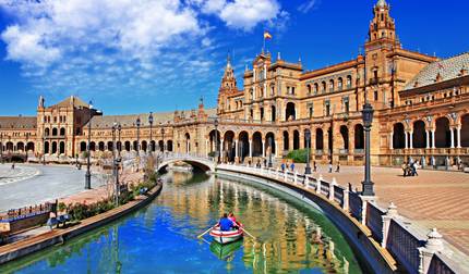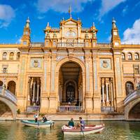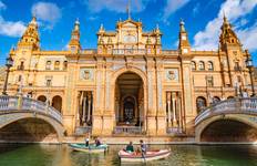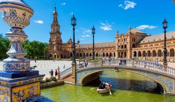 This morning starts with a guided tour through Seville. You'll see Maria Luisa Park and Plaza de Espana, walk by the Cathedral and the Giralda bell tower, then wander through the Santa Cruz neighborhood with its winding streets. Lunch at a local restaurant is included. After that, you have the afternoon and early evening free to relax or do your own thing. If you're interested, there's an optional river cruise on the Guadalquivir with views of the Gold Tower and Expo 92, or you could visit the Maestranza bullring instead. Later in the day, you'll board the high-speed train back to Madrid, which is included in your tour.