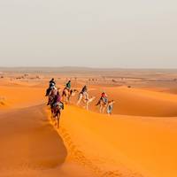 After breakfast, you're heading to Todra Valley to see the Todra Gorges with its limestone canyons and 500-foot rock faces. From there, you'll continue to the oasis town of Erfoud for lunch, then drive to Merzouga at the edge of Morocco's Sahara Desert. You'll have some time to relax at a hotel by the dunes before a two-hour camel trek starts before sunset. The camp arrives around 6 p.m. for mint tea with nomads, sunset watching, dinner, and traditional music by the fire before sleeping in tents.